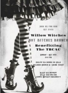 Put on your best resting Witch face and hat, grab your broom and come sip wine while supporting an amazing organization. We will have a contest for best dressed witch and best witch hat. We have a luxury raffle featuring a one-of-a-kind beaded bag, a cherry Coach bag and a bedazzled Michigan jean jacket (Go Blue!). Raffle tickets are just $20 or $7 for $100 with all sales going to the TBCAC — winner need-not-be-present to win. To purchase raffle tickets or reservations to the event, please text me, Tracy Faulkner Willow Winery & Vineyard – 832-248-1188. I will provide Venmo and/or Zelle info. Cash and credit available at the Event.